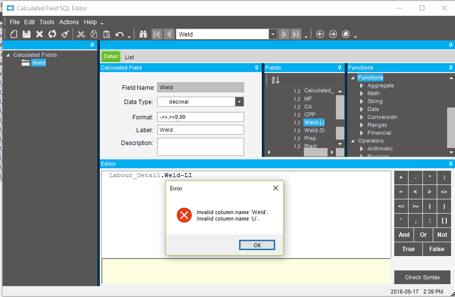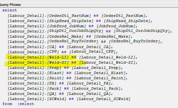 No, not External BAQ Editor. The query works in SQL Server Mgmt Studio, but not in BAQ Designer. I am doing a PIVOT on the OpCode, two codes have the dash. I can add the pivot fields through display columns and Epicor wraps them in square brackets, but I can’t get it working in Calculated Field Editor.