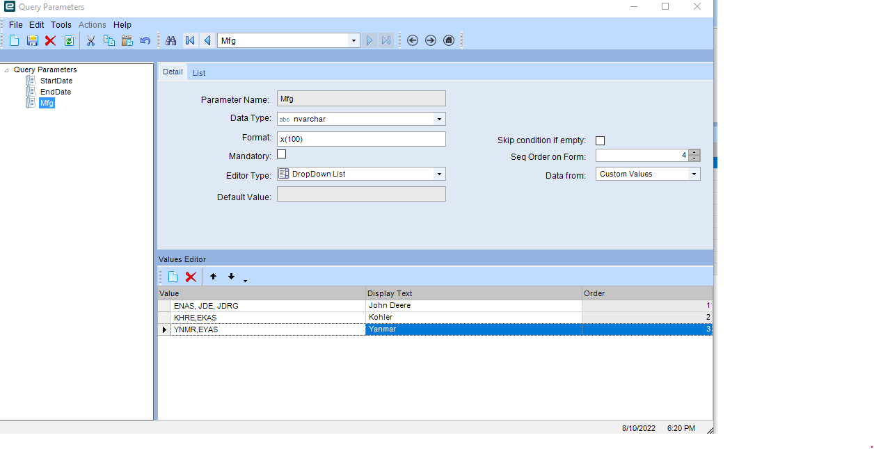 Your @Mfg parameter will have the same values and display texts like John Deere, get rid of the values with commas.