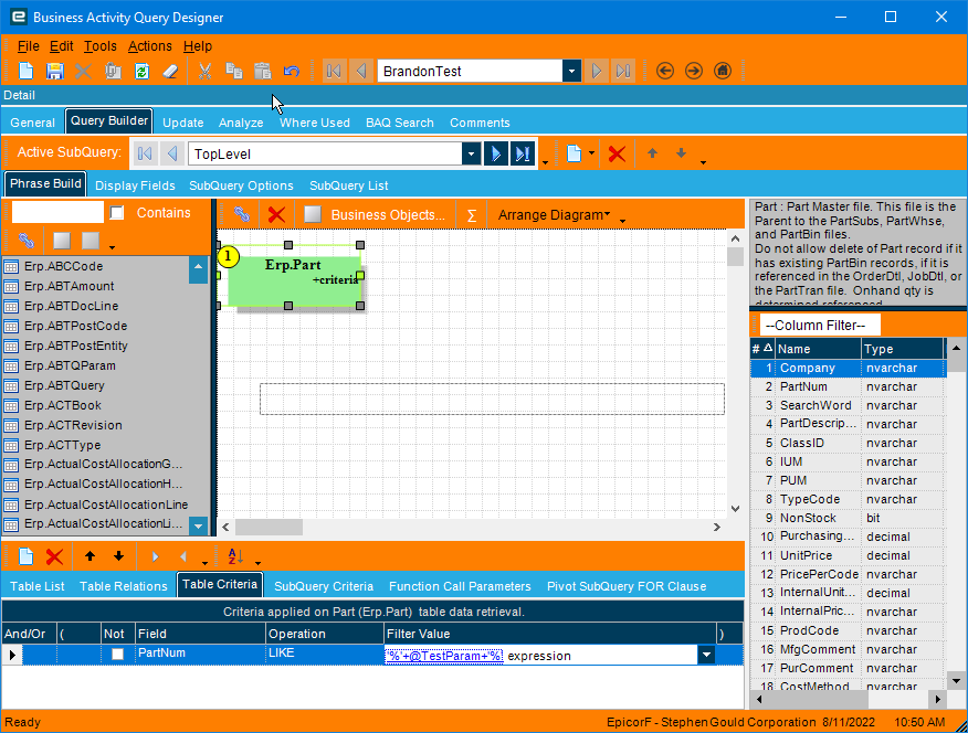 Finally, you will filter the BAQ by that calculated field calcCompany and not the Part_Company like calcCompany = @Mfg parameter