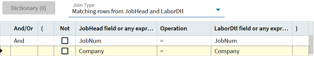 In BAQ Designer (Cloud version), if I join two tables which do not have an index or automatic entry for Matching rows in Table Relations, I add them manually, starting with Company then find a common field such as JobNum etc which shows as an “And”.
