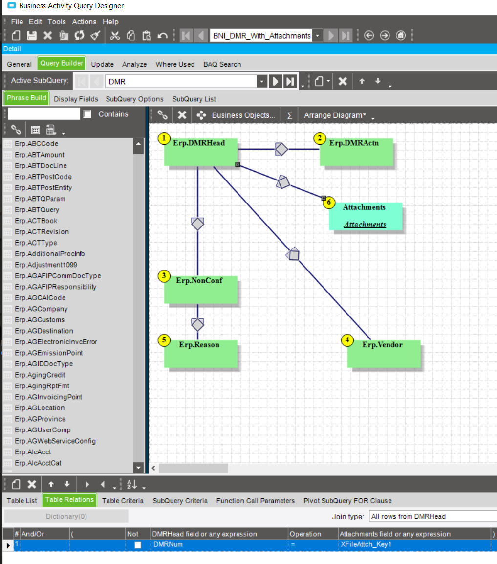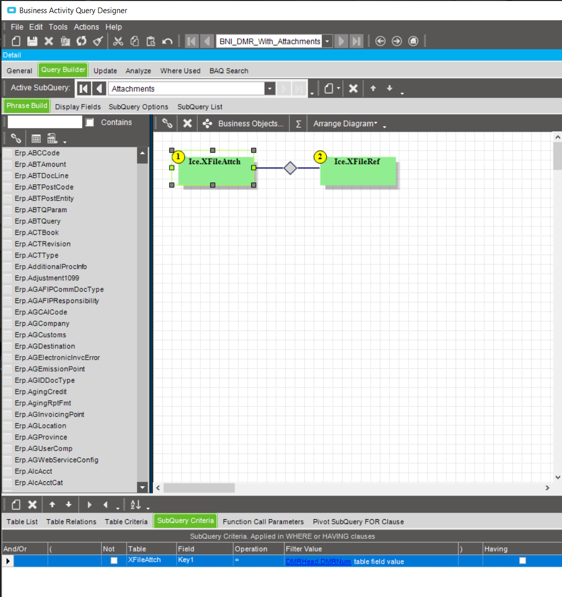 - In new subquery “Attachments” create SubQuery Criteria linking Key1 (DMR #) to DMRHead.DMRNum?