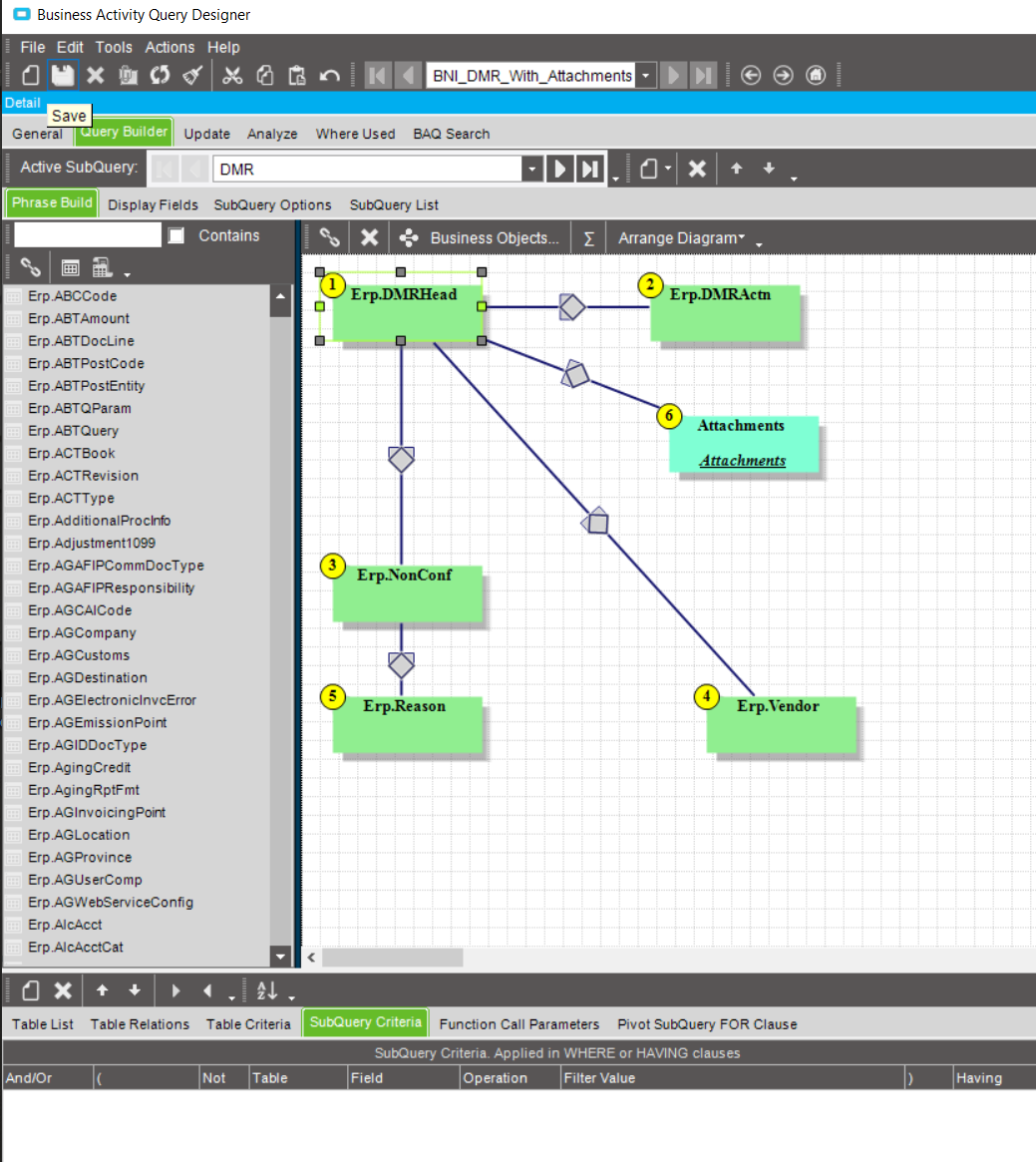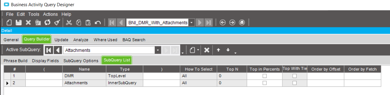 - In Top Level BAQ, click on DMRHead and create SubQuery Criteria to Attachments?