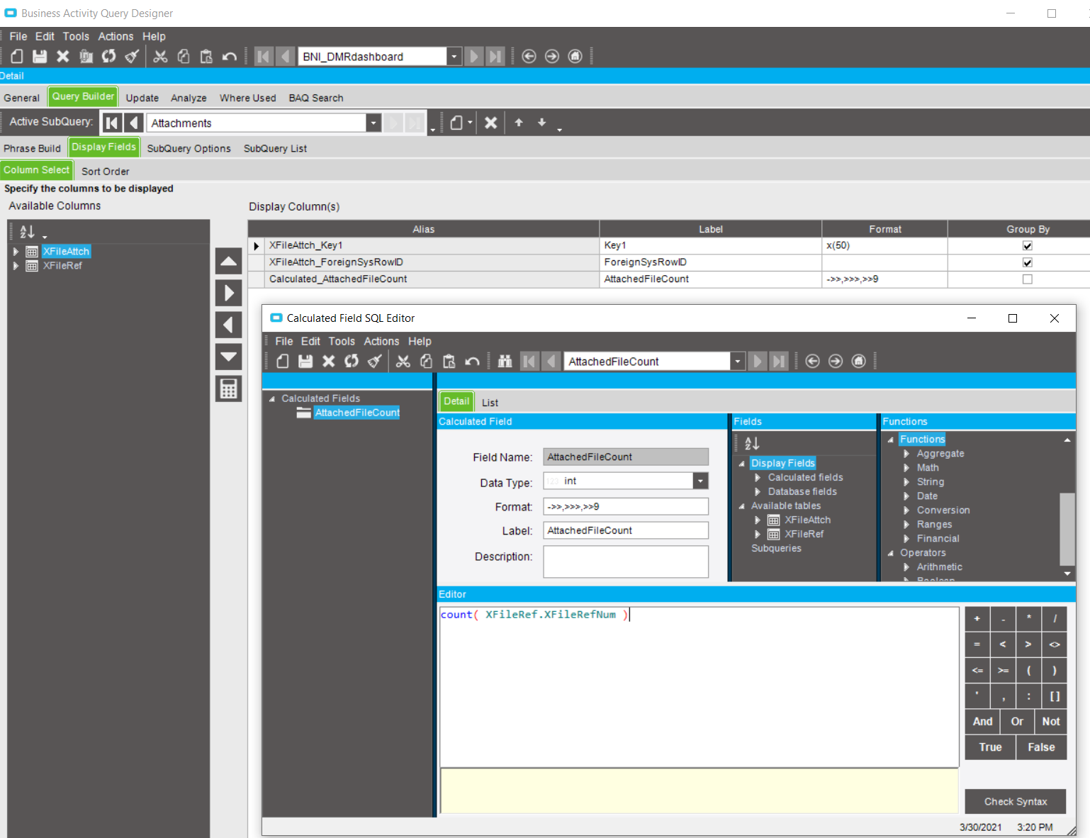What I am looking for is the right way to construct a subquery via summation or the “Count” calculation that does not create duplicate rows for each attached file. If, for example, DMR 1074 has two files attached and you run the BAQ, my expectation is that there is an “Attachments ?” field displaying Yes/No if there are any attachments to the DMR record and a second field “Number of Attachments” does a Count or some kind of summation telling the user the total number of attached files.