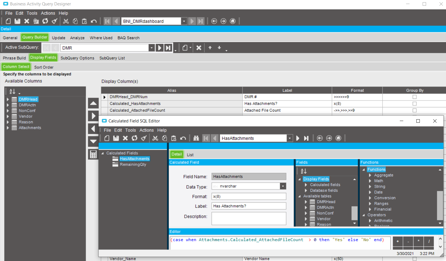 I am attempting to build a BAQ related to our new DMR internal process. The BAQ is attached for reference. The goal I am trying to accomplish is to create a subquery (since I do not think it possible to do on the top level) that displays two field calculations telling the user if a particular DMR has any files attached (calc 1), and the total number of attachments (calc 2).