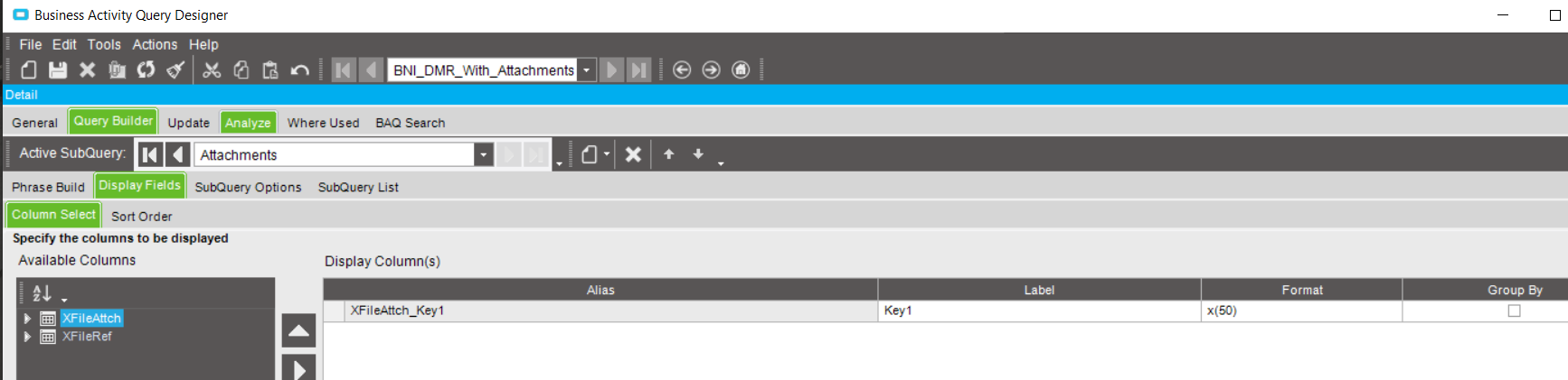 - Add Subquery Attachments to top level BAQ and link to DMRHead using DMRNum to Key1?