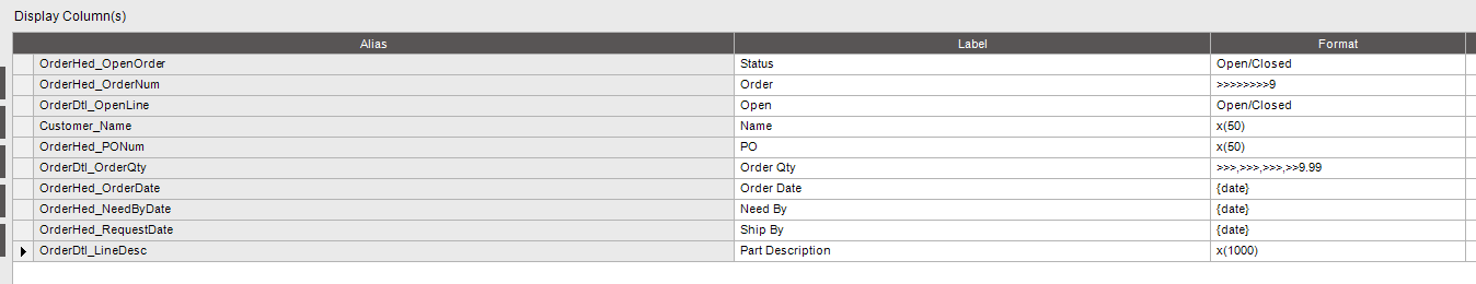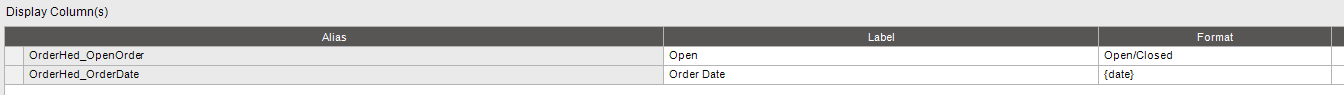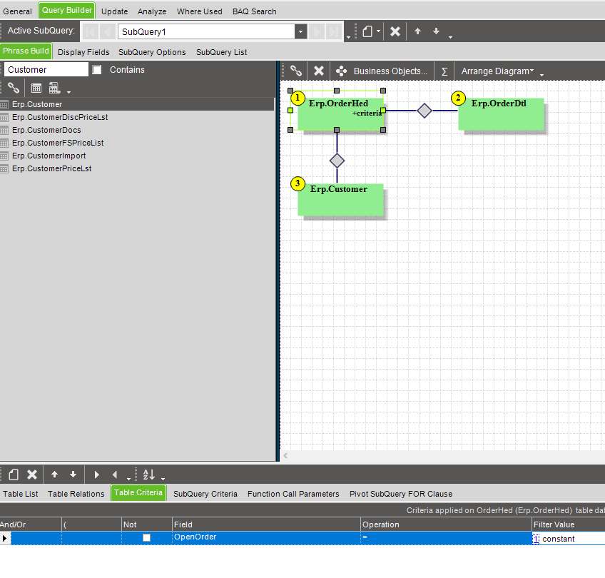 In the case of OpenOrder if you look at it in the Display Fields tab you notice it says “Open/Closed” under format and if you look on Phrase Build on the right its type is “bit”. This basically means its either a true or false statement so 1 for true or 0 for false.