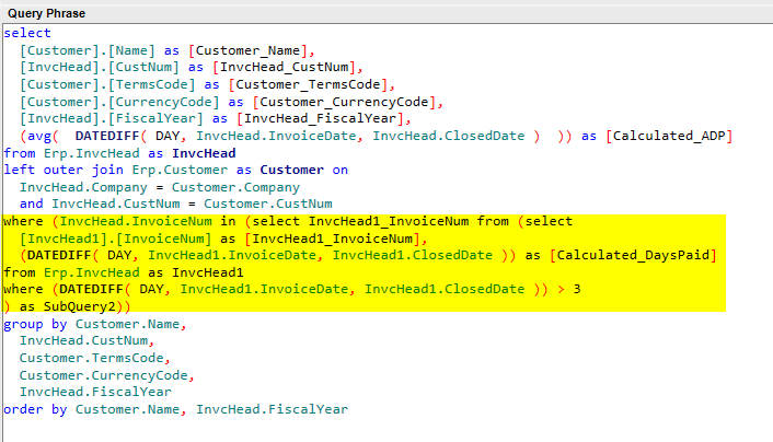 I am trying to recreate the following SQL statement in BAQ. I am calculating the Average Days to Pay (ADP) for each customer by fiscal year, but don’t want to include invoice where the ADP is less than 3. How do I create the highlighted parts of the SQL statement in BAQ