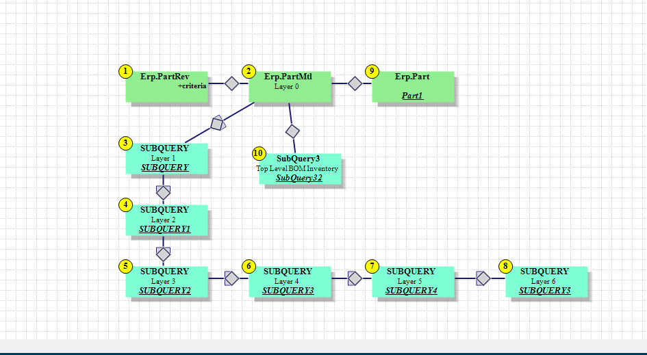 I am trying to create a indented BOM query that also includes current on-hand inventory from multiple warehouses. I have a subquery created that is getting the summation of the on-hand quantities, which seems to be working. Also, the Indented BOM seems to be working pretty well. What I am struggling with is the on hand quantity does not show up for the last level in the indented BOM (essentially the raw material or purchased part level). I am not sure why this is not showing up.
