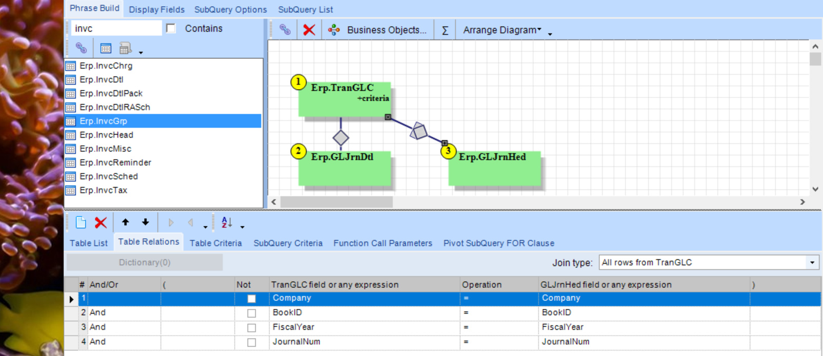 Mostlike that you need to make a relation to the Key1, Key2, etc⦠fields in Tran GLC. And definitely want to but a table criteria on TranGLC.RelatedFile