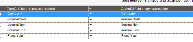 order by TranGLC.Company, TranGLC.FiscalYear, GLJrnDtl.FiscalPeriod, TranGLC.JournalNum, TranGLC.JournalLine, TranGLC.CreateDate, GLJrnDtl.JEDate, GLJrnDtl.PostedDate