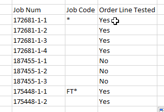 I need to check each group of jobs which are all related to the same Sales order line and if all the Jobs ‘Job Code’ field do not contains a * then display the Sales Order Line as Not tested.