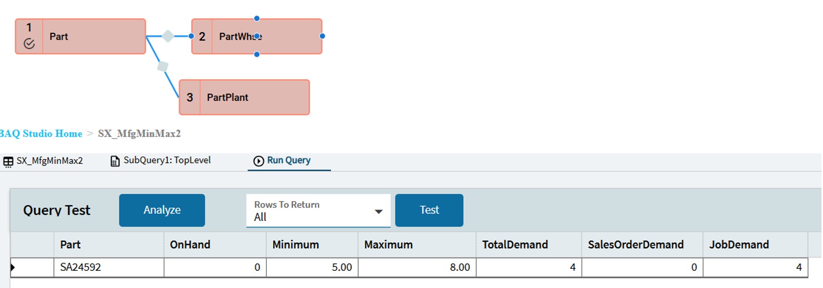 Help! I’m pretty good with BAQs, but this one has me stumped. I have a report pulling basic data for manufactured parts. Here’s the portion of the report that is working.