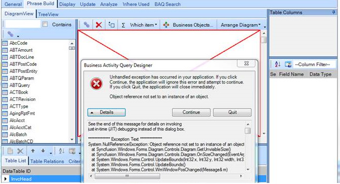 Is there a way to find out when a BAQ was last modified or updated? We are getting an “object reference not set to an instance of an object” every time we open the BAQ and then it errors if we ‘quit’ or ‘continue’ on the next error message.