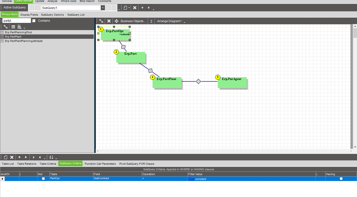 If the report is only items in subcontract, then you can make your join be an inner join; matching rows from SubQuery1 to Part as the join type.