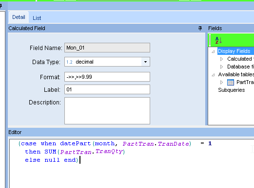 If we can, I would like to have the YearMonth across the top And just the PartNum appear one time in the row to the left. I may have to do it in three queries, just thinking out loud. I was able to do it by the month but i was hoping for YearMonth.