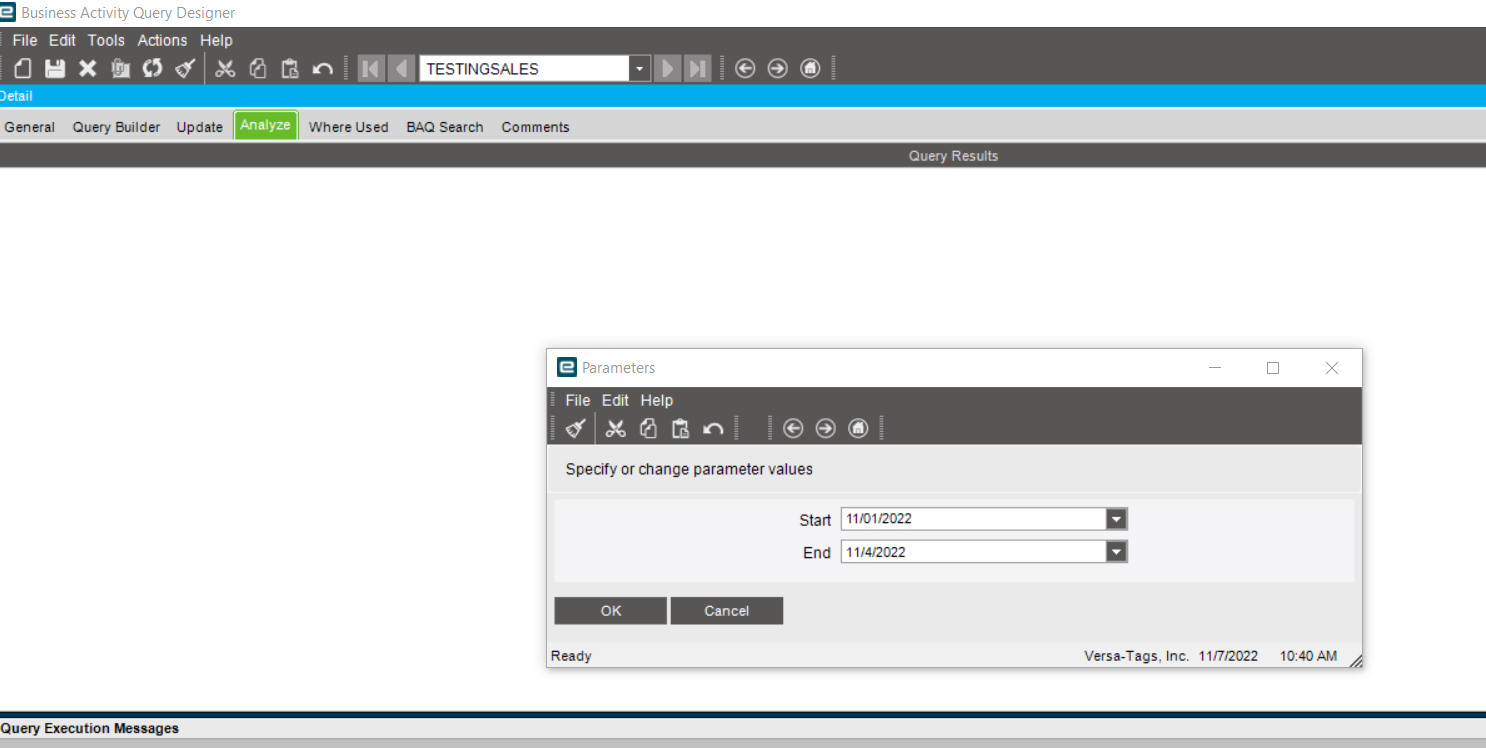 I am creating a simple BAQ query listing the customer, part # and total sales by a date range entered by the user. I want to be able to see 2 additional columns: the previous years sales and the difference withing the same chosen date range.