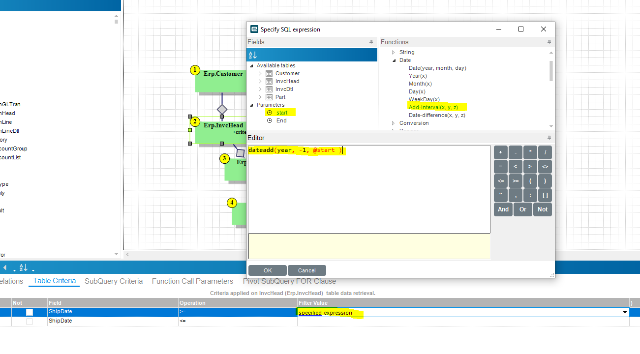 If you use the criteria ShipDate>=@Start and ShipDate<=@End you won’t be able to get previous/next years as it will limit the BAQ result to just the period you selected there. So you need to extend that to 1 year in both directions. In your criteria there, use an expression instead of parameters. You will have something like:
