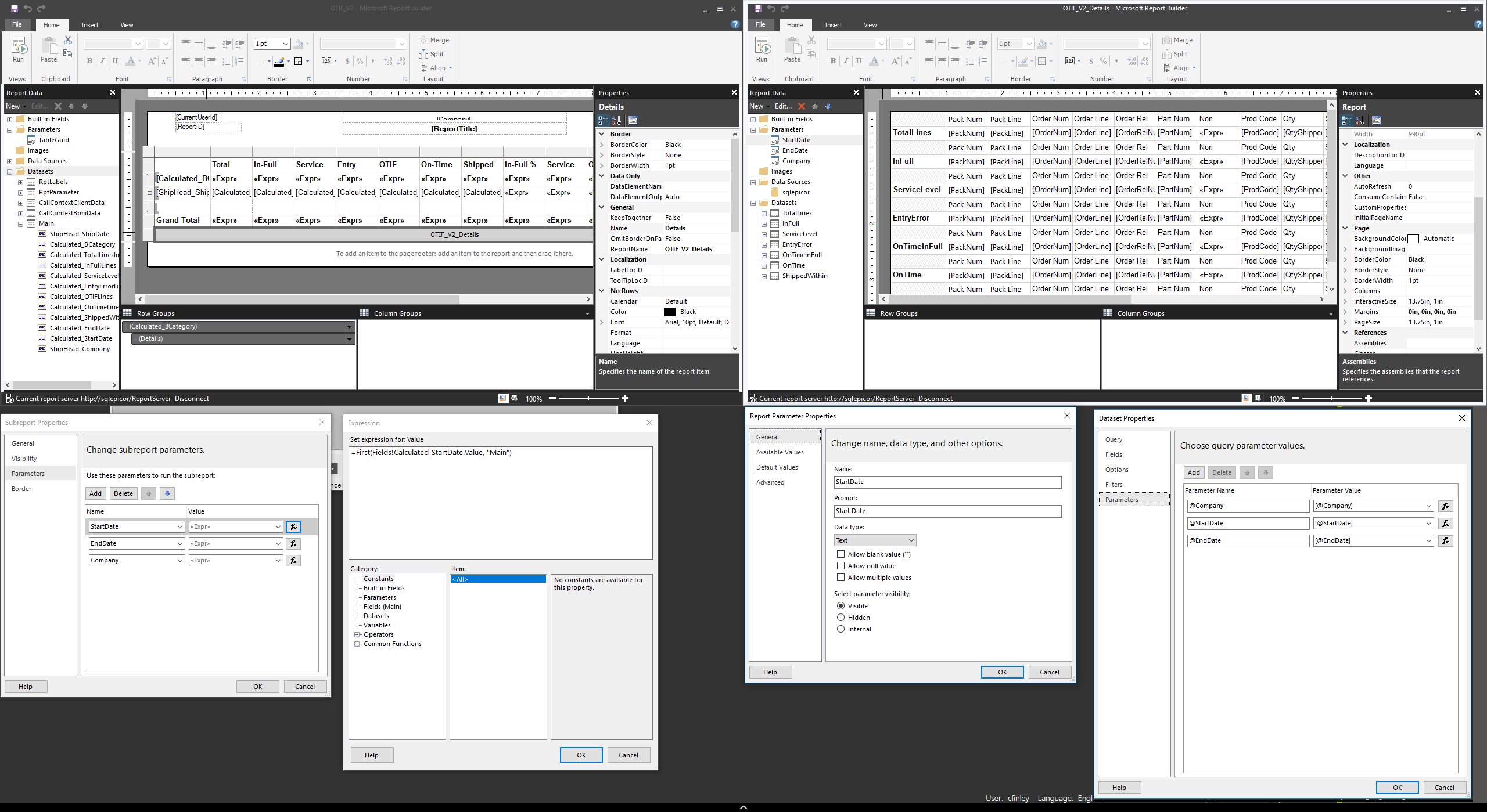 One last thing to try ⌠In the subreport RDL, create defaults for the parameters, enter fixed dates, such that they donât filter any data. Like the default for StartDate being 1/1/2000, and the one for end date being 12/31/2021. Test run the subreport by itself in Report Builder. Does it run without prompting or generating any errors?