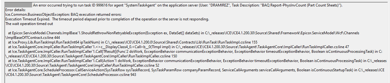 A bit of an odd one here. I have a BAQ that appears to work fine. I can run it wide open in BAQ designer and it executes in maybe 10 seconds. I have an SSRS report that I’ve been working on all day and it’s been working fine… but all of a sudden, as I am messing around with the filters and options, I am now getting an error that says: