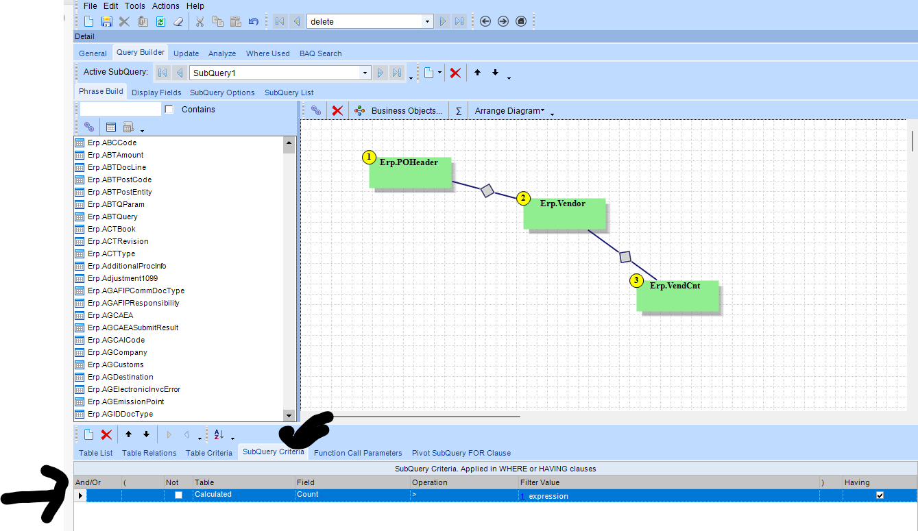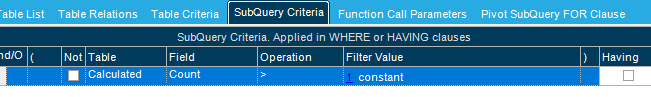 Thanks, Ken! I tried your final one, and it ran. Then I tried filtering out Count<=1 by adding a SubQuery Criteria of Count > 1, but that errors out also.