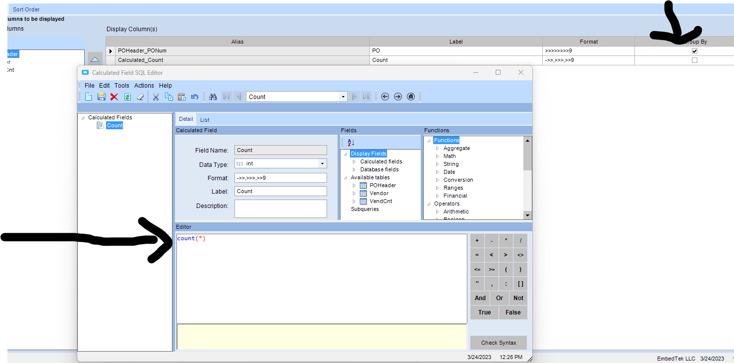 Then I added CustID, which gave an aggregate error, so I checked group-by. Then 0 records are returned.