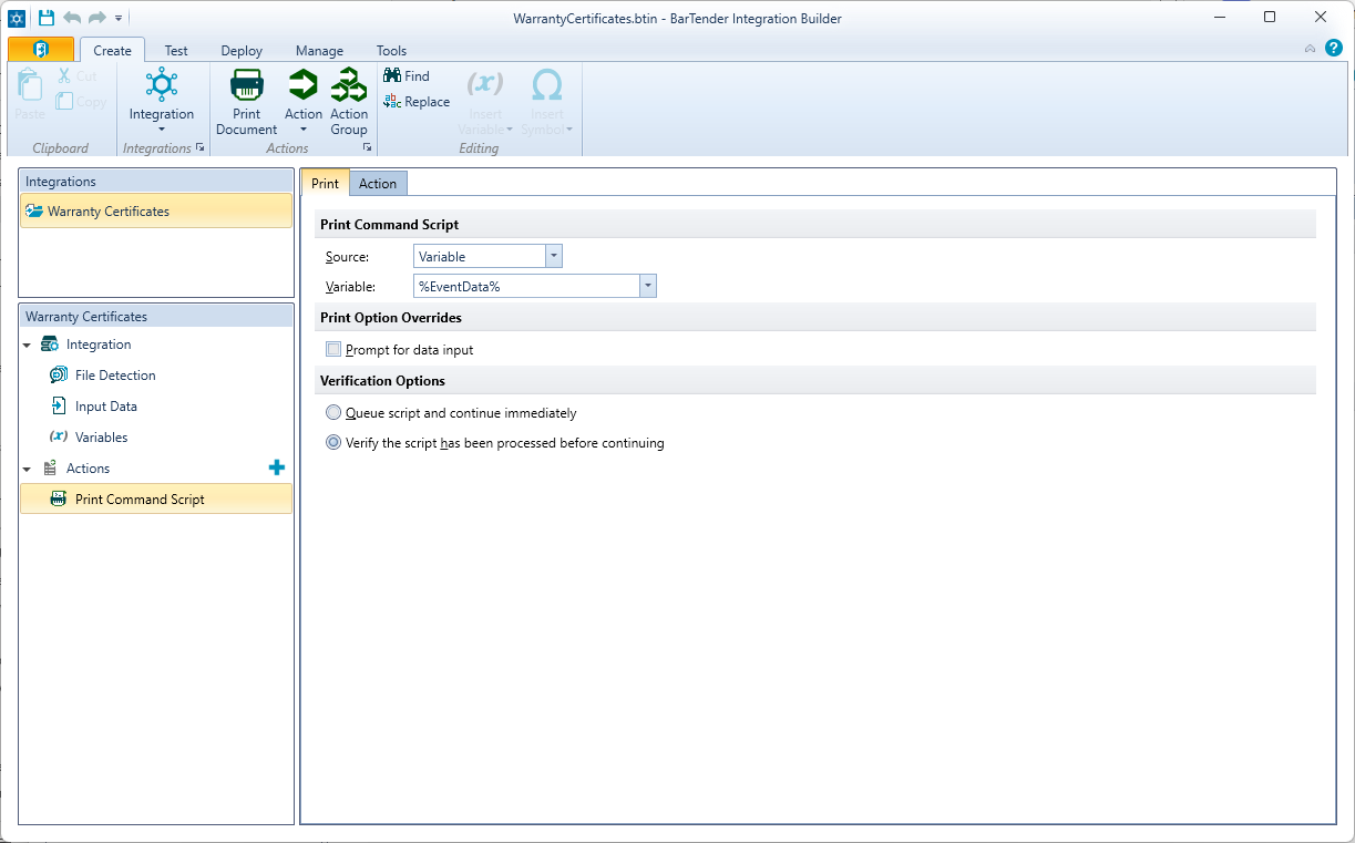 I created a Bartender form to bind the data from the .bt file, and created an integration for it.