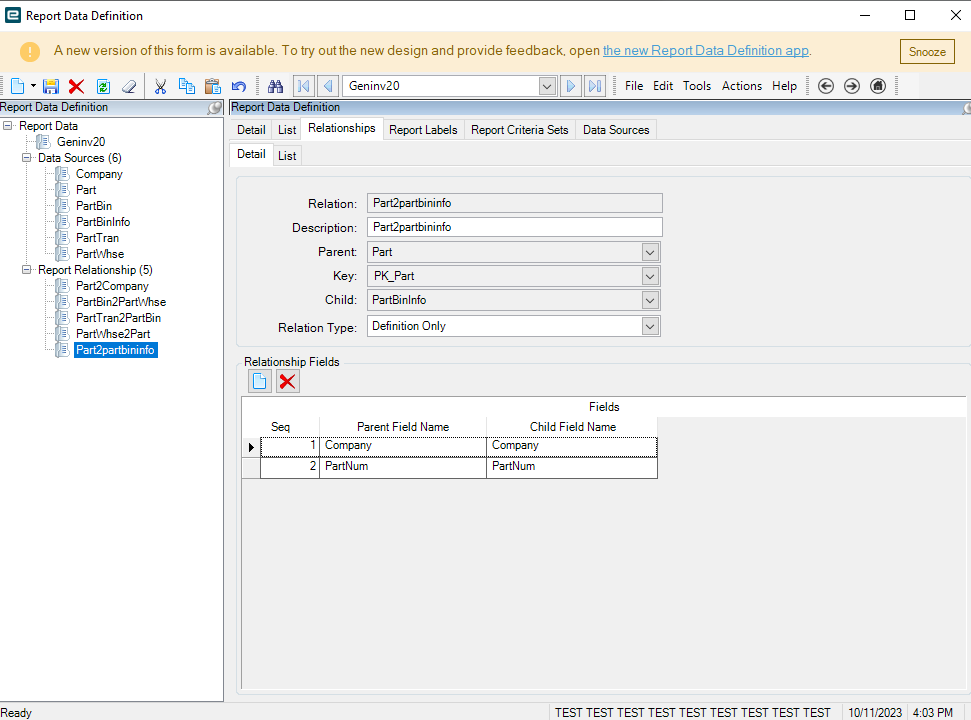 My question to you is, what table in the original RDD holds the identifying fields that you can use to join to partbininfo so that you can return ONLY THE MATCHING ROW from your partbininfo table? What fields do you need to use so that you can join to the partbininfo table and only retrieve the matching row from the part bin info table that matches your transaction? I’ll give you a hint on the fields you’ll need. You need the company, the part number, the warehouse, and the bin.