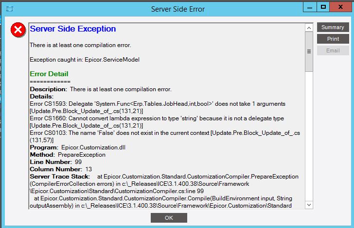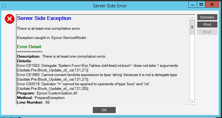 The BPM BAQ designer isn’t quite up to par with the regular one. One thing I see that could be the issue is (and looking at the error message may be the one) your Table criteria JobEngineered <> 0. Unfortunately, the BPM BAQ designer needs a hard true or false (Doesn’t accept 1 or 0 for bool). So just change 0 to false and that error should clear.