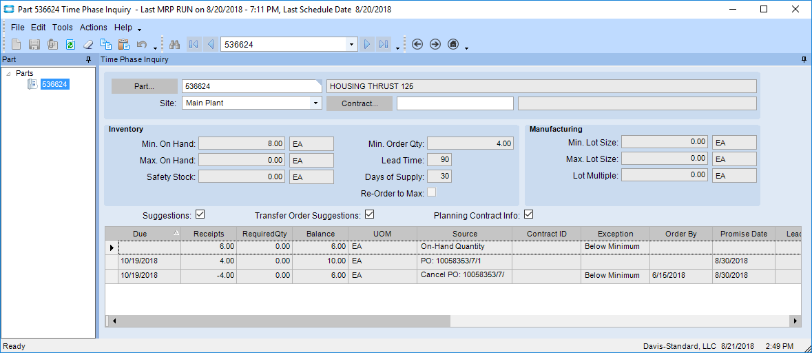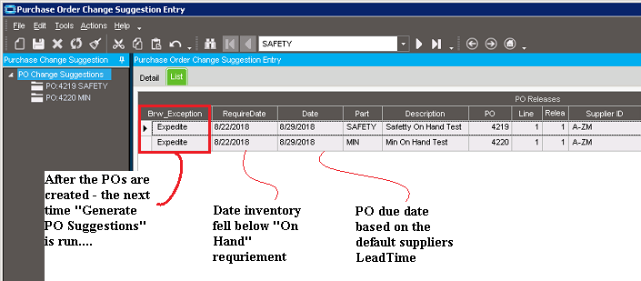 We are seeing dozens of PO Change Suggestions to cancel orders that were created to cover a minimum stocking level. Here is the Time Phase screen from one part as an example.