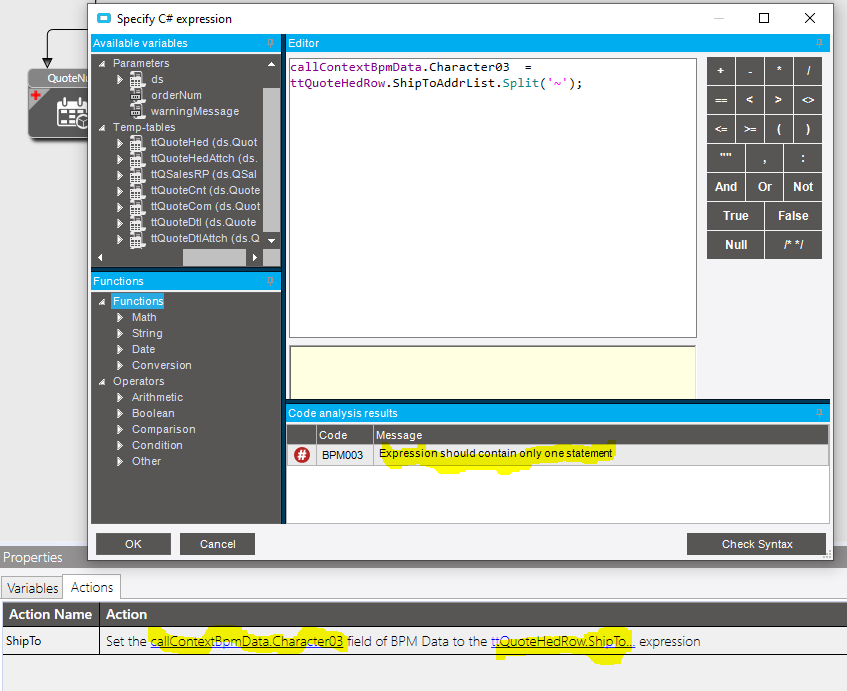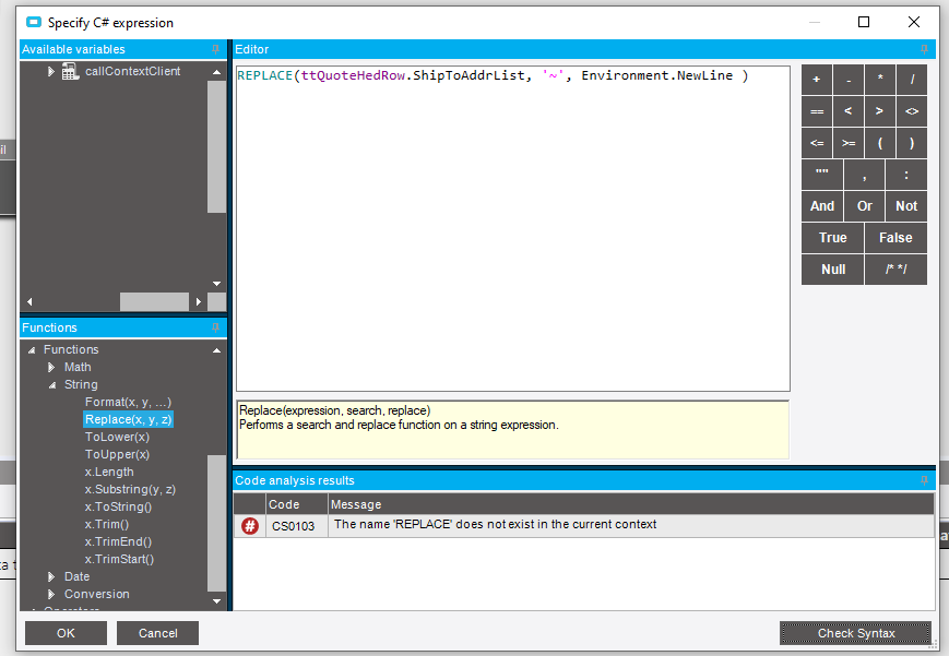 BpmFunc.Replace(ttQuoteHedRow.ShipToAddrList , “~” , Environment.NewLine )