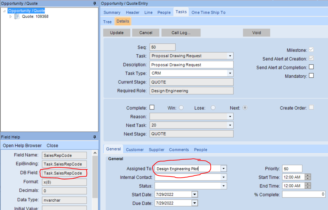 Many of our quote tasks get initially assigned to a “group” first and then a manager assigns that task to an individual (or an individual assigns it to themselves). I want an email to go out when the task changes (and Send Alert at Creation is checked on that task), or when the “Assigned To” changes but the task has not changed. You can see in the field help, that the Task.SalesRepCode is the field that identifies the “Assigned To” for the task and that does not exist in the temp-table.