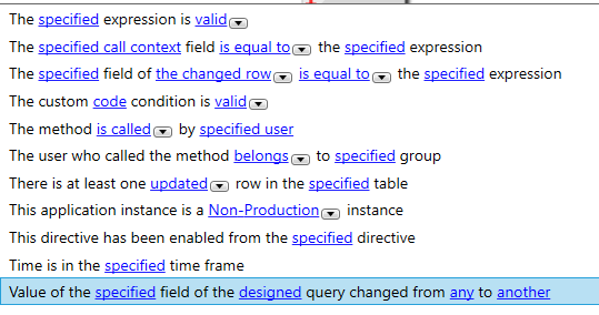 If I wanted to evaluate the condition if a value on the temporary table changed from any to another, I would just choose the condition statement “The specified field has been changed from any to another”.