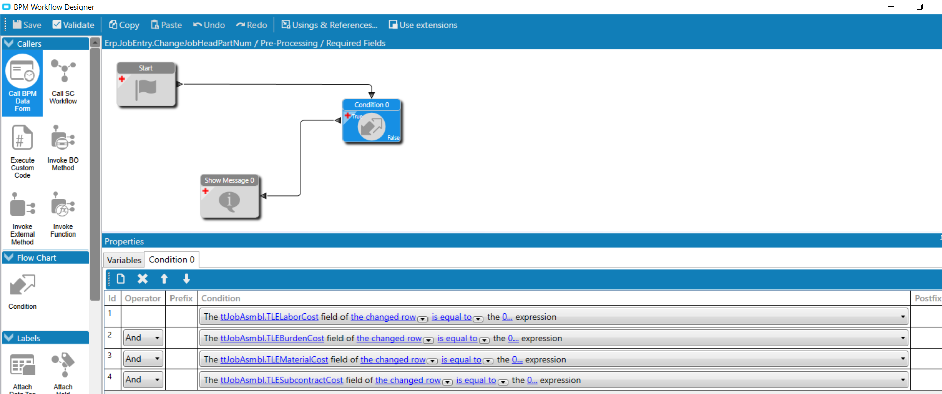 I am trying to make a BPM that will show an error message when a user enters a job for a part with no standard cost. The only way I’ve found so far is to make it on the JobAssembly table and check the TLE value of the job on pre-processing. However, when I enable the BPM it does not go off. Has anyone done this before or know of a better way of accomplishing this?