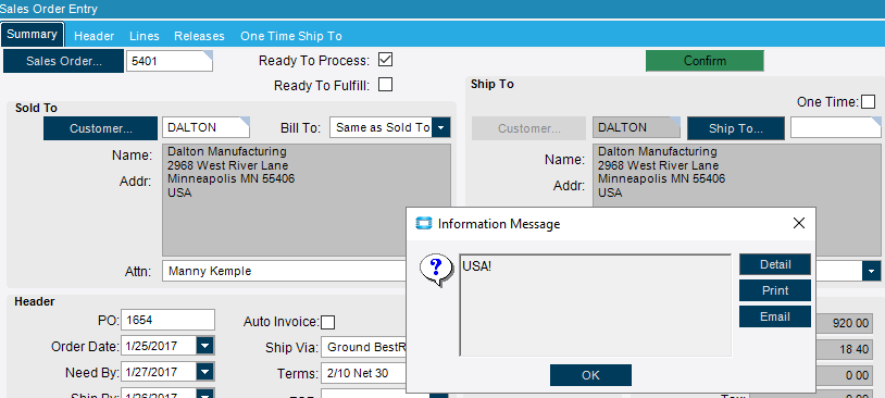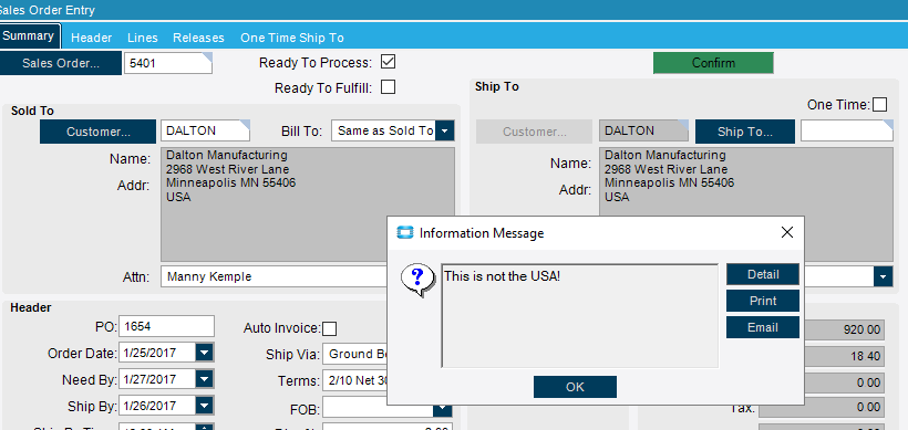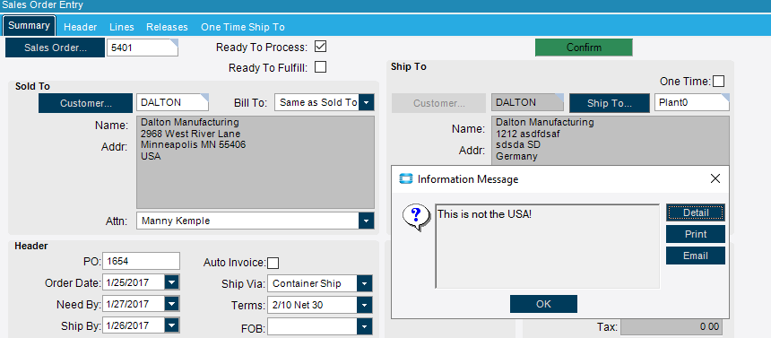 Second, it could be possible that the user gets all the lines added, and after the lines are added, they change the ship-to address to/from domestic/international. This is a different issue, I would likely put together some advanced BPM code (C# for E10) that goes through the order and changes each line. Of course, there’s the added issue that the “ship-to” is on the order, line and release - so you may have to take into consideration if your company ships orders to multiple ship-to addresses. It is possible one line would be domestic, another line international.