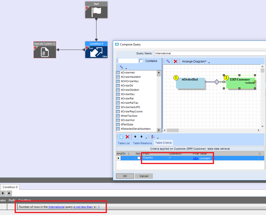 Thank you for the response. I’ve only been working with Epicor for a month or so and have gone through a lot of the embedded and online courses, but even that material doesn’t cover everything. I’ve been working on this off and on for the past few days. The first part of your reply is not an issue, but the second part has me stumped. For my company, we will never ship to multiple locations that would mix domestic and international. That being said, I’ve setup a BPM on the SalesOrder Update method, under Pre-processing where I have a condition that checks if the OrderHed ShipToAddressList field contains “US”. If it does then the OrderNum is set to a variable, and the flow passes to a Custom Code action (see code below). In this action it should go through each record with the OrderNum saved in the variable then change the ProdCode field, which in this case is just TESTING until I can get it to work.