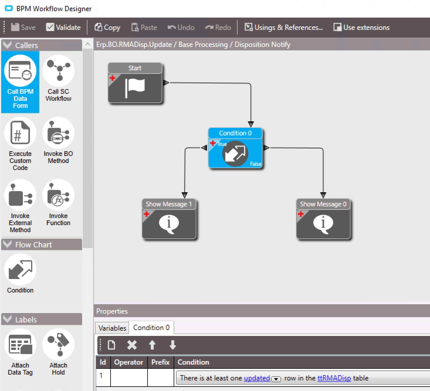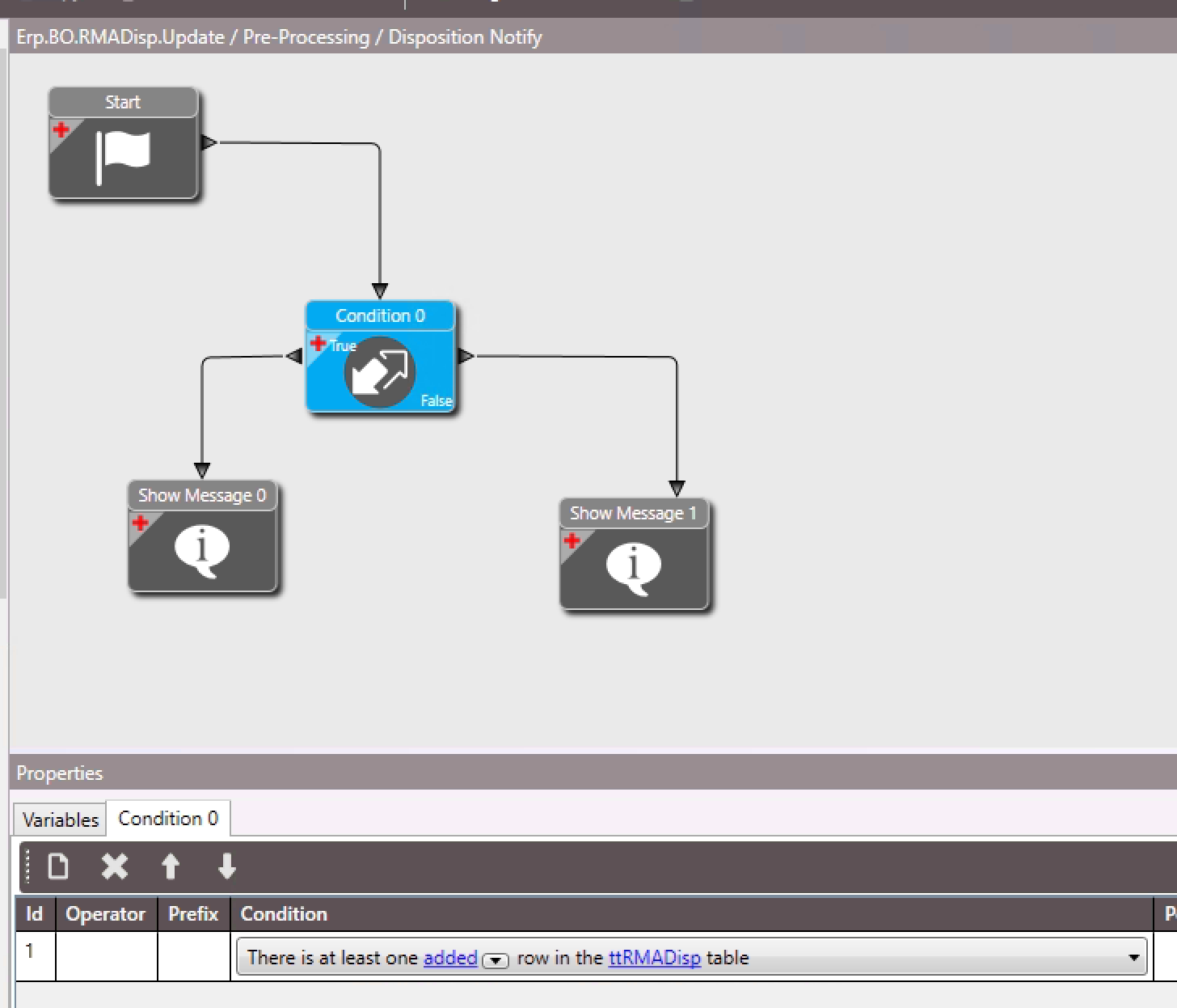 I am trying to create a Method Directive on RMADisp which will email me when a new RMA Disposition is created, but I can’t seem to get the condition to trigger as expected. For testing purposes, I set up a Message to display TRUE or FALSE depending on the condition results, but no matter how I try to build this it returns FALSE when a new RMA Disposition is created. What am I doing wrong here?