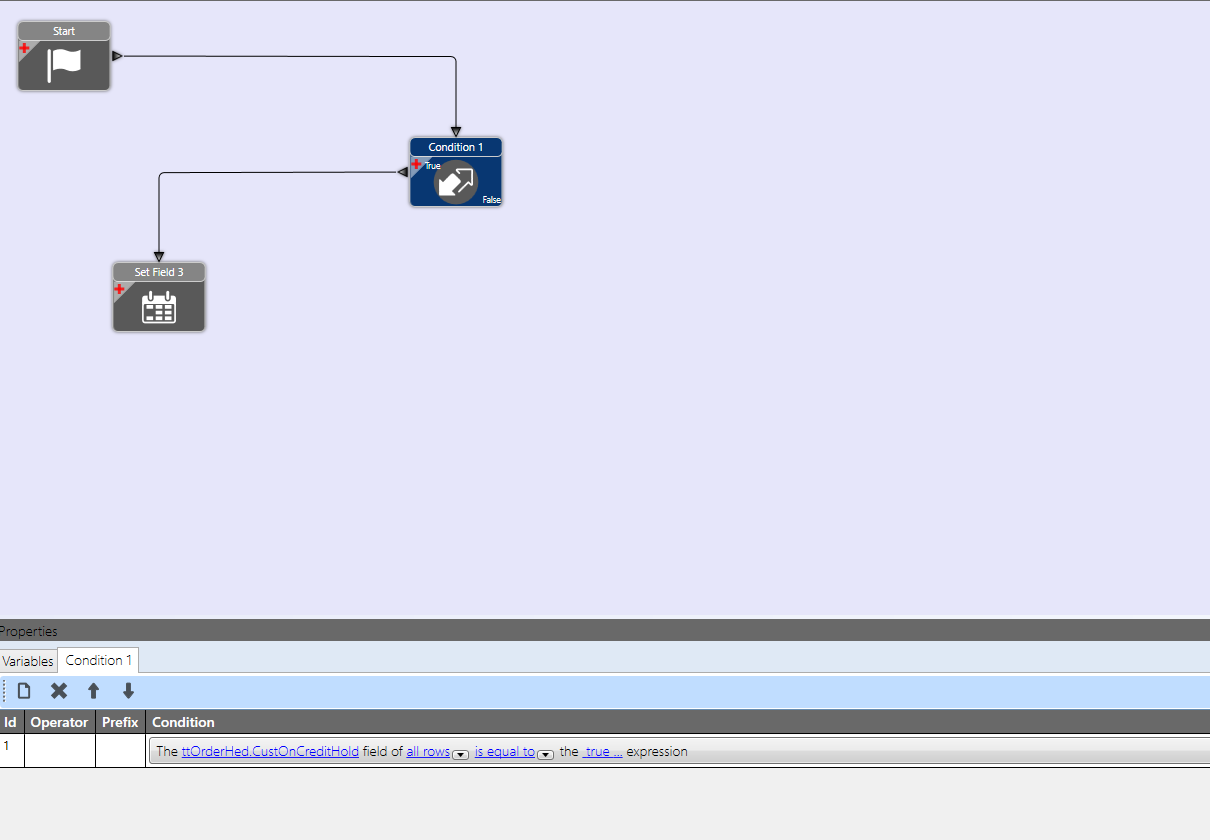 Being a stubborn writer of code, I’d check to see in PreProcessing, if the Order was put on Credit Hold, and set a CallContextBpmData field accordingly. Then in PostProcessing, I’d check that CallContextBpmData field and see if I needed to loop through all the OrderRel records and change the field. I don’t think you can set the value of a field on all the records with a simple Set Field function. Again, I could be wrong. There’s probably a better way, maybe the Update Table By Query function, vs using Custom Code. In fact, maybe that’s all you need to change, is use Update Table By Query instead of Set Field, giving the OrderNum and setting all OrderRel values for FirmRelease to false.