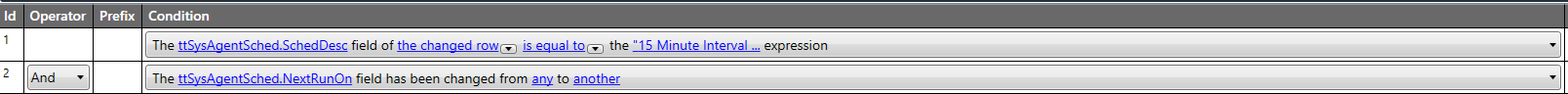 I have a task scheduled that runs every 15 minutes and I want a DD BPM to trigger off of it. I have created an in-transaction DD under SysAgentSched. I have made a condition statement that looks for the description to match the name of the schedule I created and for a change to the next run from any to another. I have written up some C# code that should trigger whenever these conditions are met that will update an existing row of data in the UD02 table. Credit to this post for the idea: