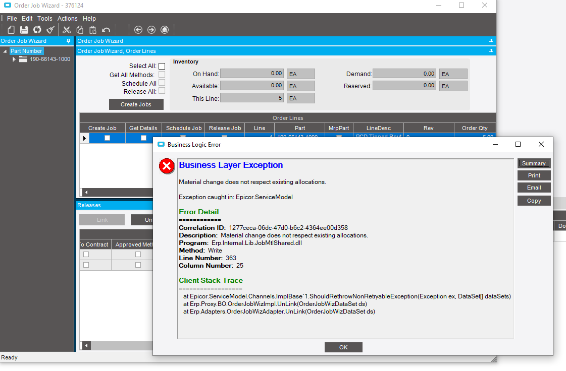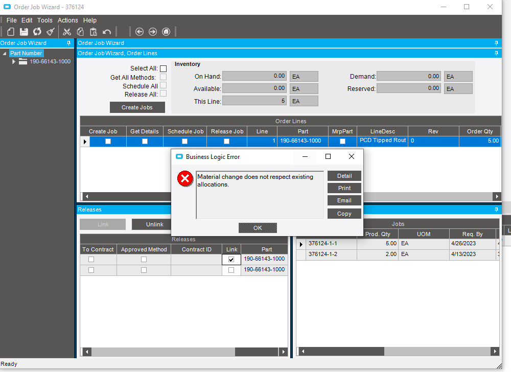 I am trying to change the production qty on this job, and when I hit save, I get this message. I have done a lot of trouble shooting with this job and I continue to get this message.