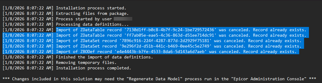 [1/19/2026 9:05:19 AM] Import of ZDataSet record āb979cf73-a123-426f-ad84-0574a5e13647ā was canceled. Record already exists.