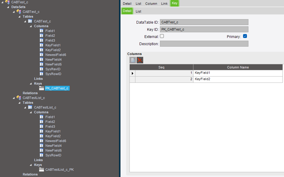 How do you set up your keys? I used the PK_xxx_c key that is generated by default, but changed the fields as shown below. After a number of failed attempts to install solutions, I ended up with a table in my target environment that has the sysrowid as the key and the solution install says āZKeyField: Row has been modified by another user and couldnāt be updated.ā I had selected to āDelete the Previous Installā, which caused the ZBODef and ZDataSet to be deleted, but the delete fails for the ZDataTable with the message āDelete failed for āCABTest_cā. Deletion of ZDataTable records must be done manually.ā We are on prem so I did but it didnāt resolve the problem.