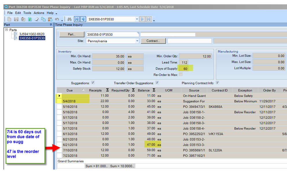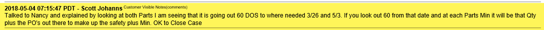 “Talked to Nancy and explained by looking at both Parts I am seeing that it is going out 60 DOS to where needed 3/26 and 5/3. If you look out 60 from that date and at each Parts Min it will be that Qty plus the PO’s out there to make up the safety plus Min. OK to Close Case”
