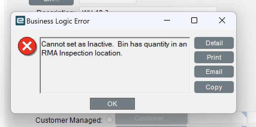 Problem is I have about 20 ish bins left that I cannot mark inactive because I get an error saying there is quantities in RMA in that BIN.
