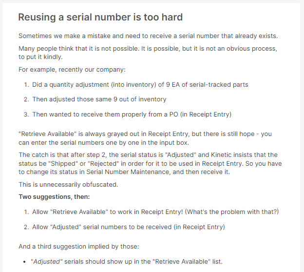 I would like to note there is a means to delete a serial number. If you assign it to a job and then it has no other transactions and you unassign it, the serial number gets deleted. We had to make a bpm to warn folks becasue they’d do this occasionally… new / different job, etc, and accidental deletion was done after planning already printed reports / memos with a planned sequential serial number.