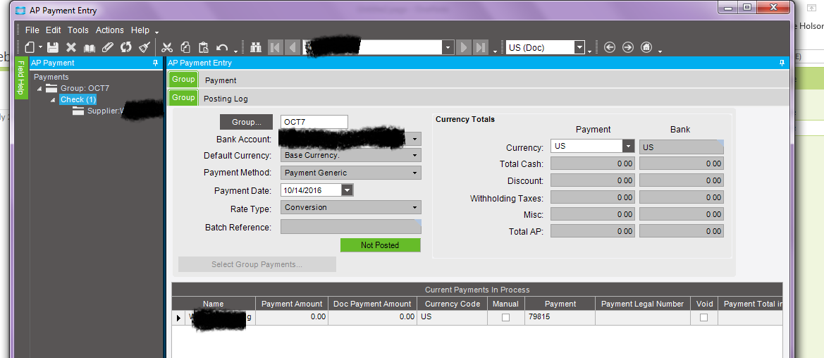 I have some old AP payment groups that were left behind by a prior accountant and I am having all sorts of issue and errors trying to delete them. All groups have one line that has zero value so I am not concerned about changes to ledger if deleted. I do not, however want to post, since these check numbers have been used since by accounting when they enter manually. Help.