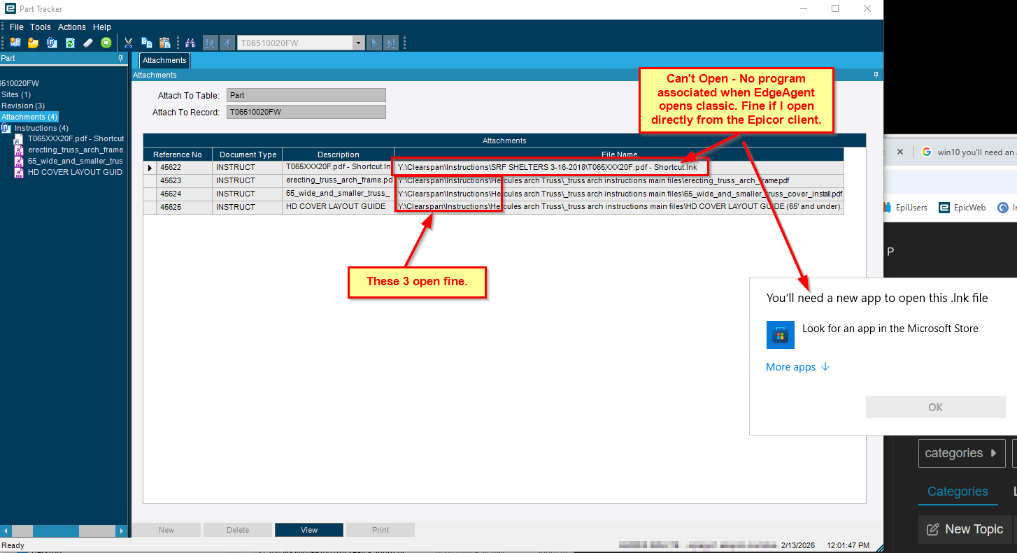 Unfortunately, opening .lnk file attachments via an Edge Agent classic form are confusing windows, and it can’t find an associated program to open it with. Weird, since I can open it in file explorer or with the classic program in the client just fine.