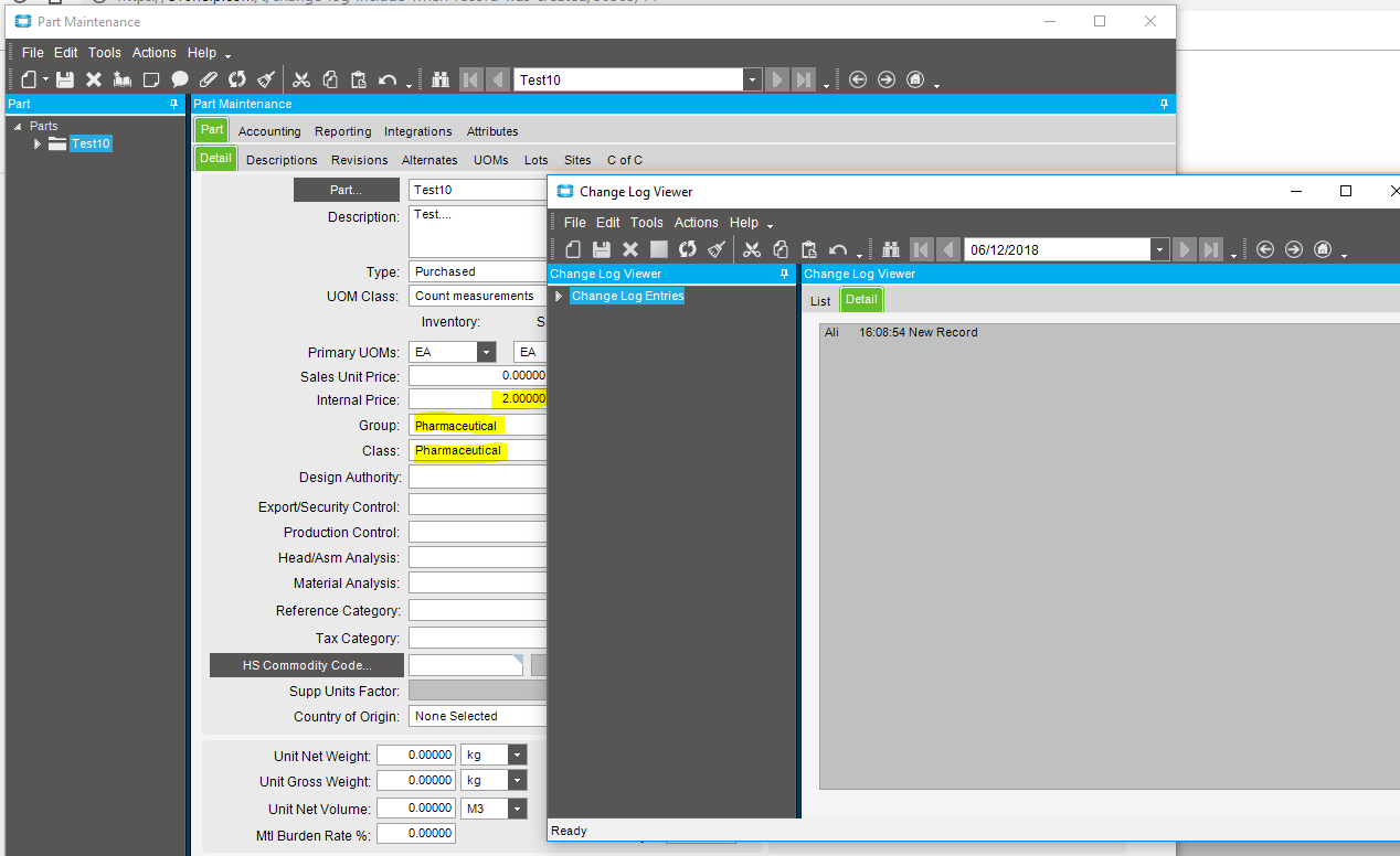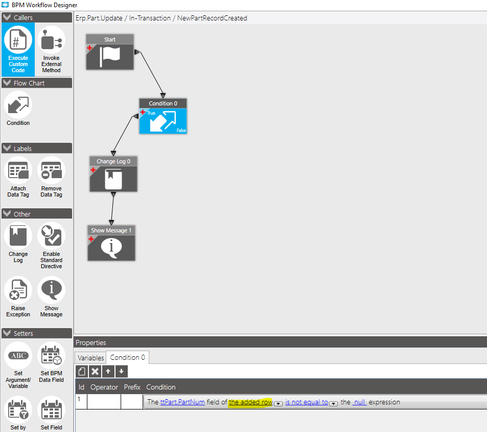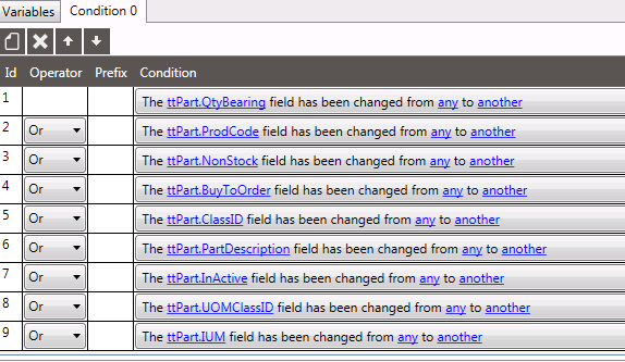 I have a DD to populate the Change Log for the Part Table. I have a condition block to monitor 9 fields.