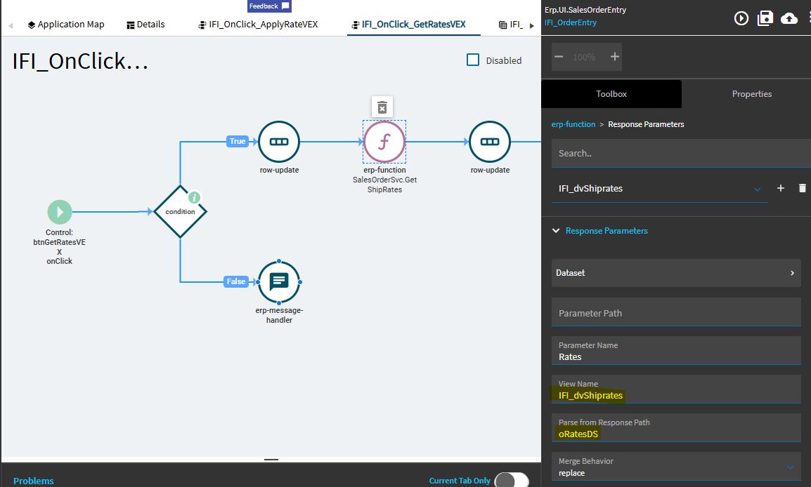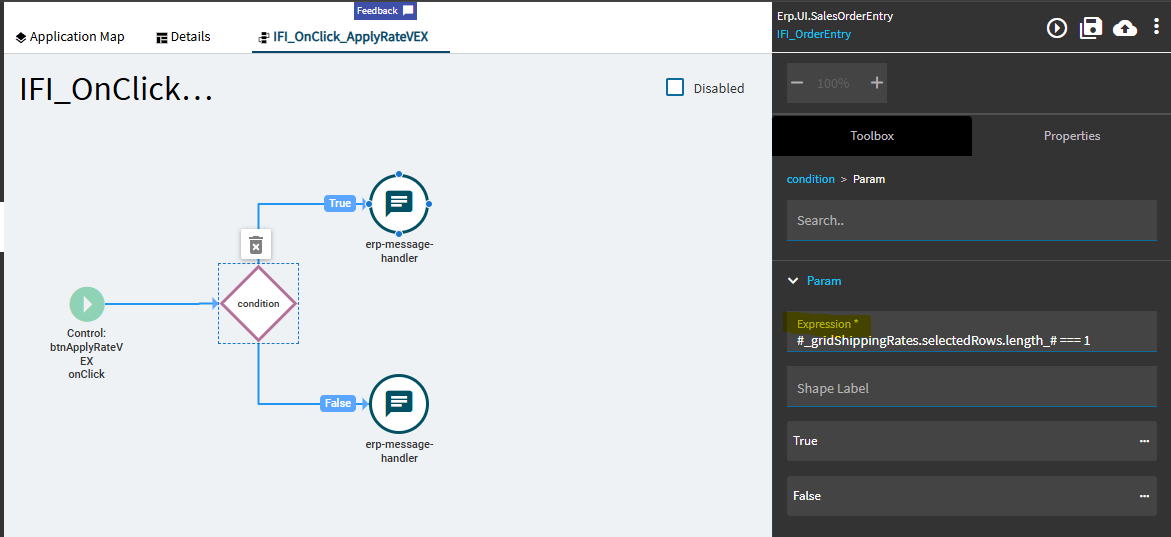 In App Studio, I created an event (Type=Control, Hook=On Click, Target=myApplybutton) starting with a condition widget with these Properties: