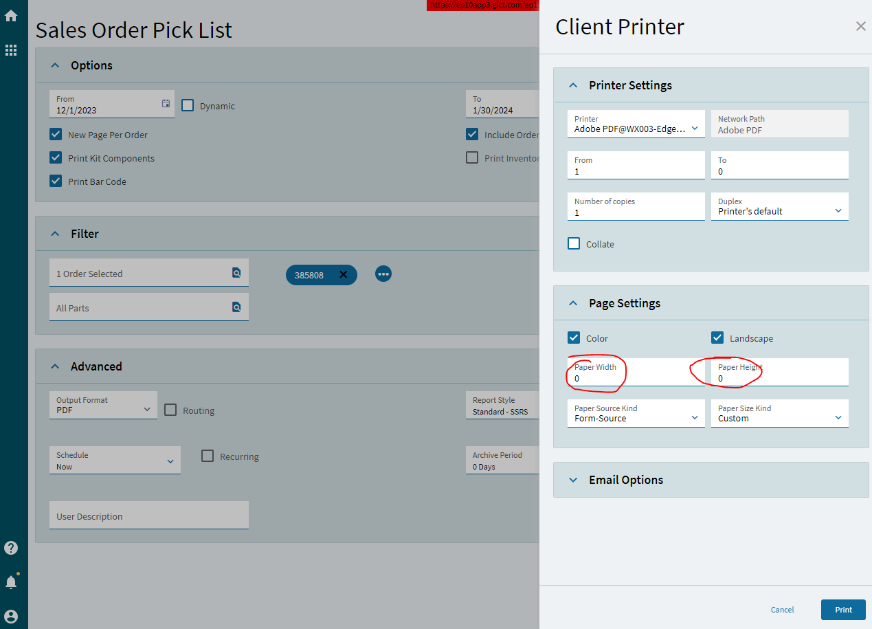 We are working win 2023.1.18 (browser only, edge agent running) and all of our client prints have zero for page height and page width (see below). Sometimes this doesn’t matter and the report prints fine, but many other times this makes the report print about 60% in size.