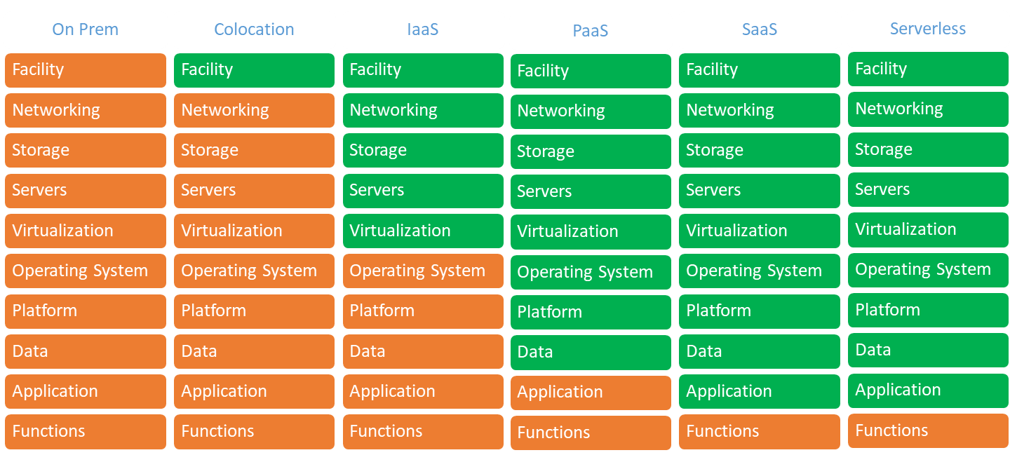 Different Cloud Providers will provide various combinations of these levels with many, many products. They have Price Calculators to help calculate a projected usage and to manage wild billing cycles. They are useful tools when determining how cirrus you want to be. It all depends on how much you want to manage (orange) or how much you let the provider manage (green).